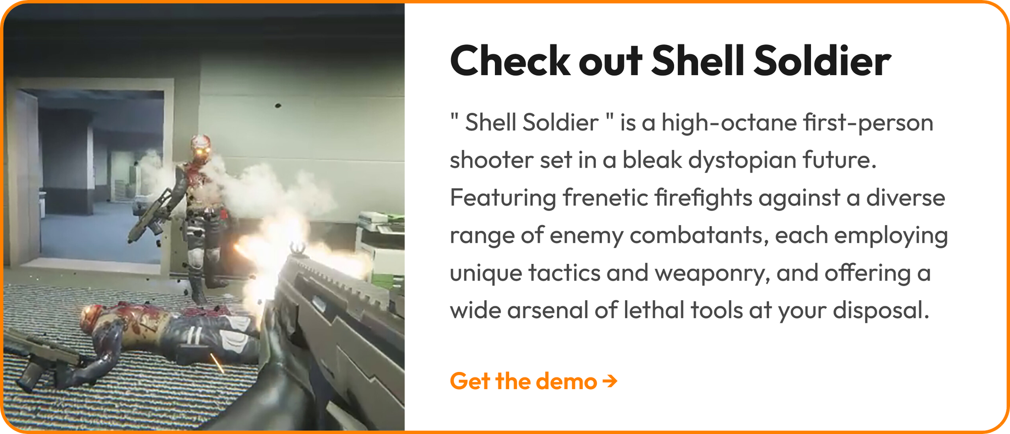 CatHuntTree is developing and publishing a game that does exactly that. Its name is Shell Soldier and is a single-player action FPS set in a dystopian world where you are a nameless test subject who woke up and is now fighting for his freedom.